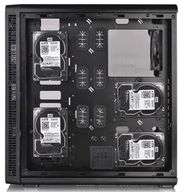 В них же можно установить и накопители форм–фактора 2,5 дюйма. Кроме того, на обратной стороне перегородки корпуса можно разместить ещё четыре «больших», 3,5-дюймовых диска или восемь 2,5-дюймовых.