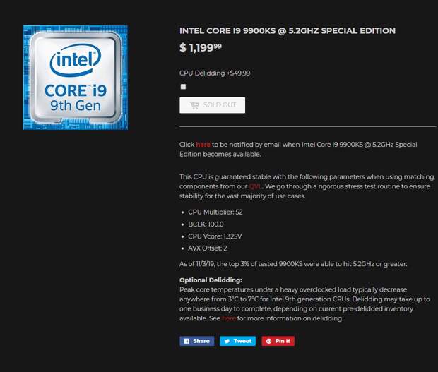 Но вот что удивительно, вскоре после старта продаж все топовые варианты Core i9-9900KS с частотой 5,2 ГГц были раскуплены. То есть, есть те, кто готов переплачивать, несмотря на то, что никакой практической пользы от этих 100-200 МГц, как показали тесты Core i9-9900KS, нет.